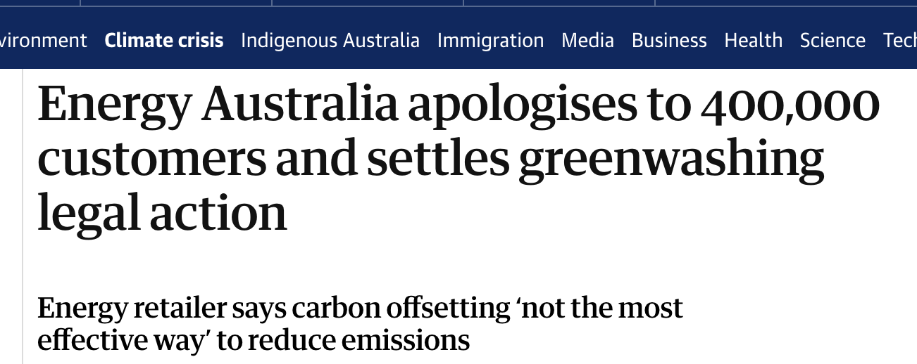 One of Australia’s three electricity utilities agreed to settle a case brought by Parents for Climate against its misleading environmental sustainability claims. Energy Australia was forced to issue an apology admitting that carbon offsets are not effective and, crucially, do not render its fossil-fuel based electricity plans carbon neutral or green.